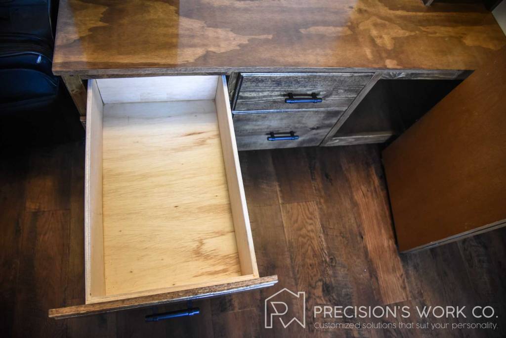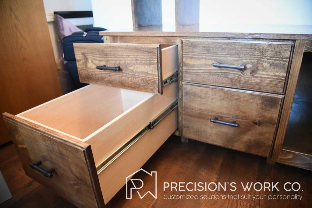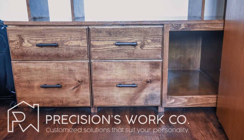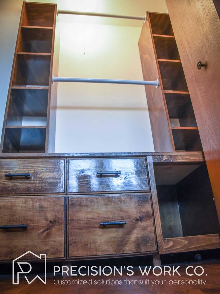 Our team designed this custom cabinet so that it has two racks supported by shelving units on both sides. The bottom unit has four drawers with full extension going all the way to the back wall. These drawers can hold a large amount of clothing, shoes, or other items. The is also a large open shelf at the bottom that can host a suitcase or other large items.