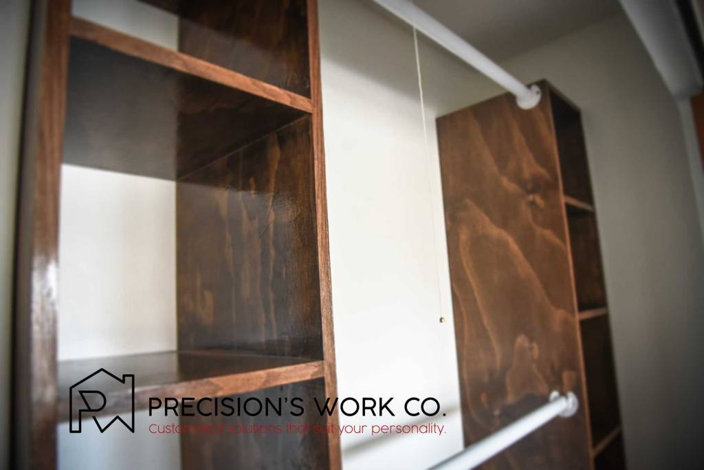 This closet cabinet was custom-designed to fit a closet and optimize the space for cloth storage. Before this build, the client only had a single wired shelf rack that could hold several hangers. The closet has a chimney going through it and could not support a full rack end-to-end. The customer wanted to have storage space as well as a longer rack to hold more hangers.